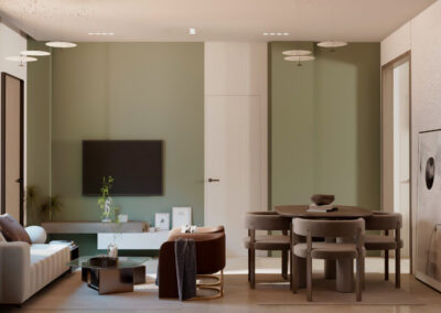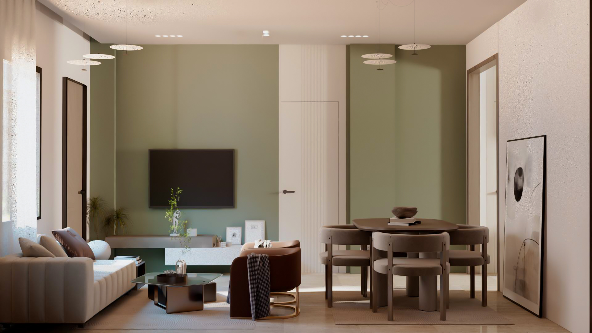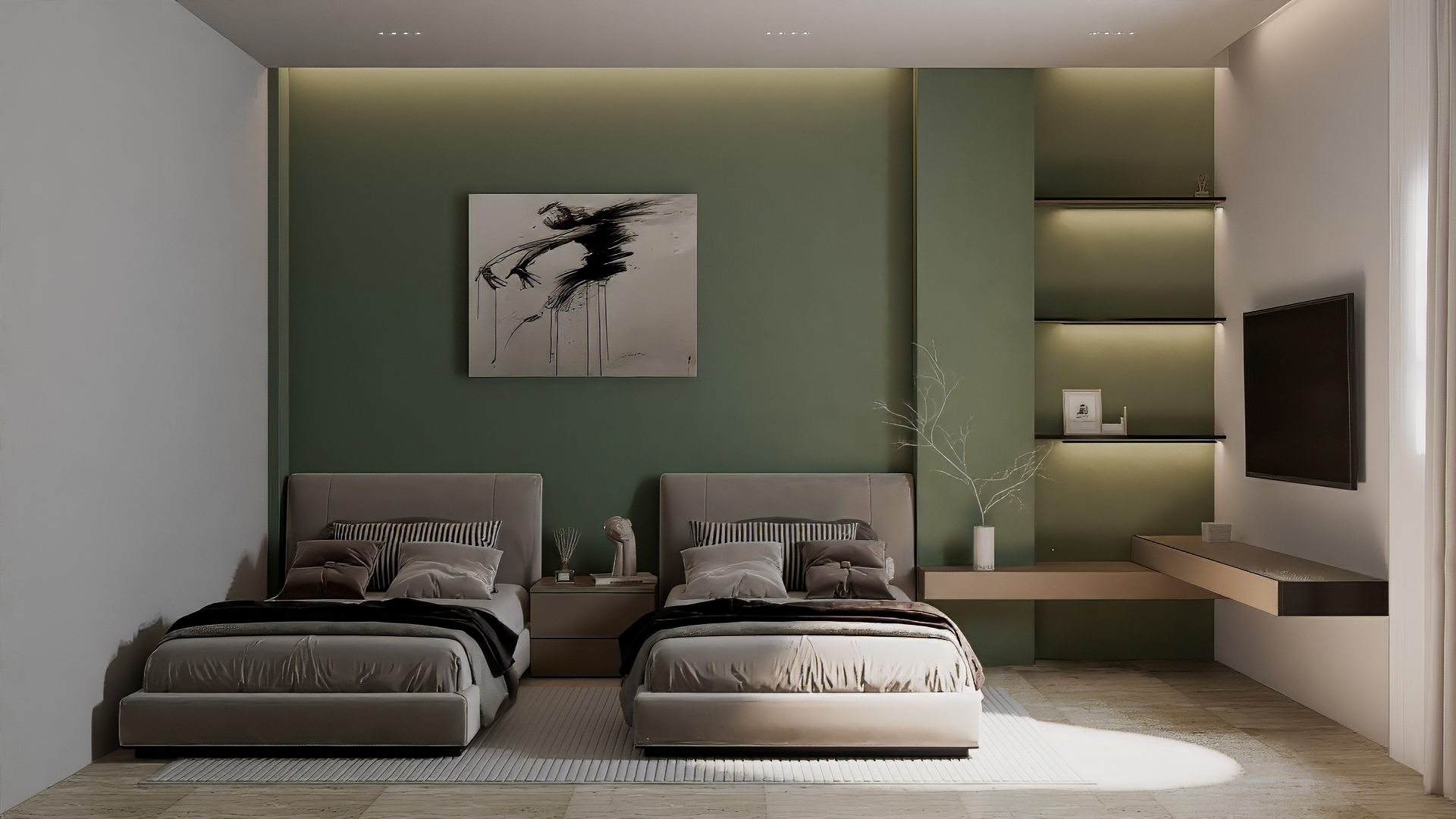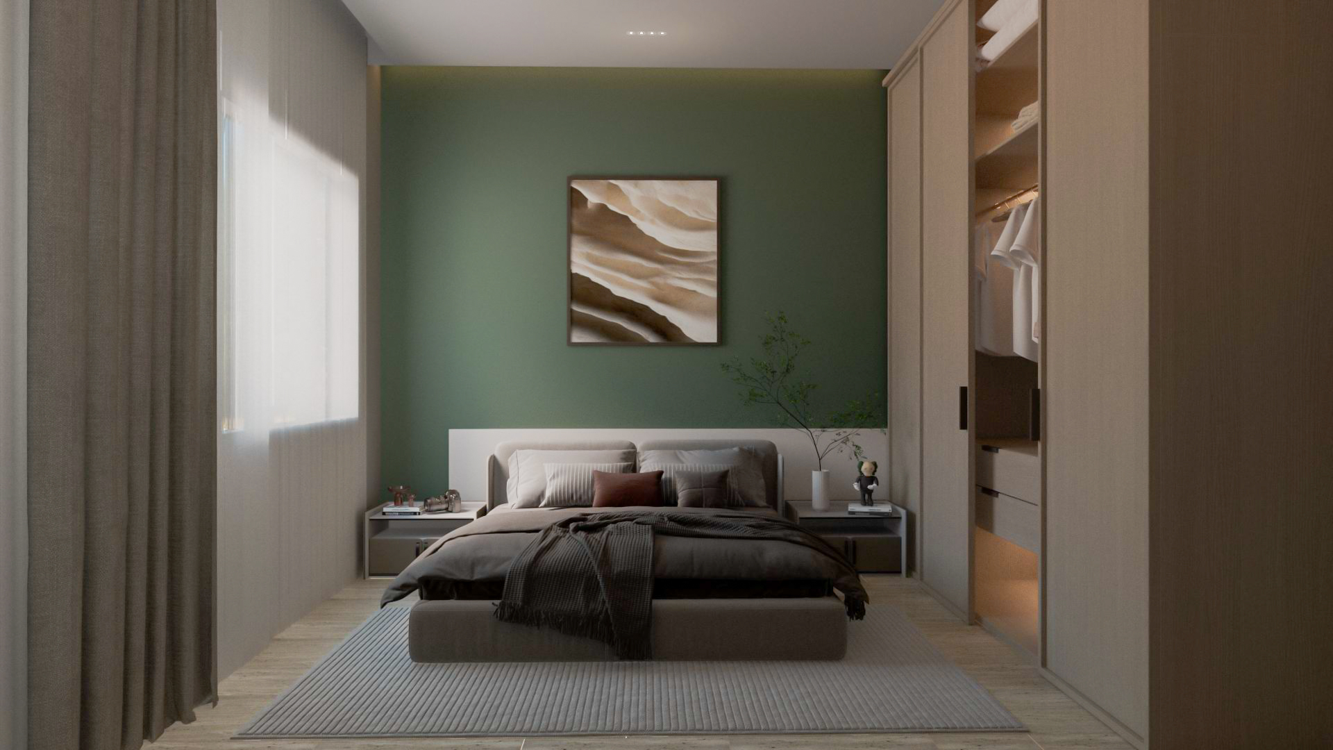 A main accent wall in soft olive green for a natural, relaxing mood.