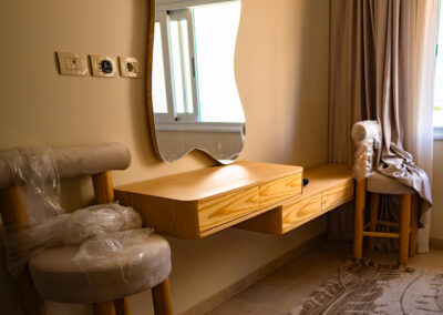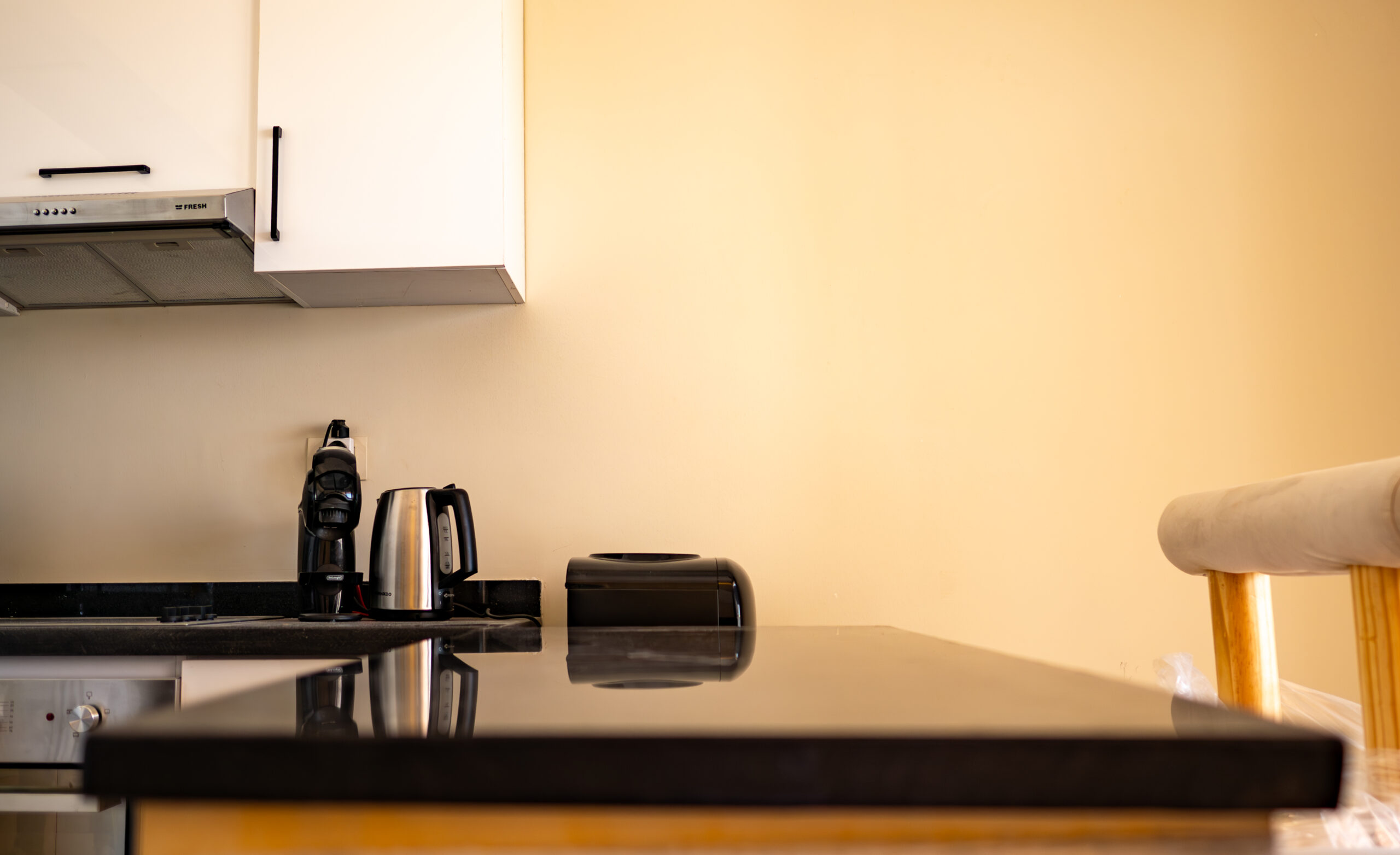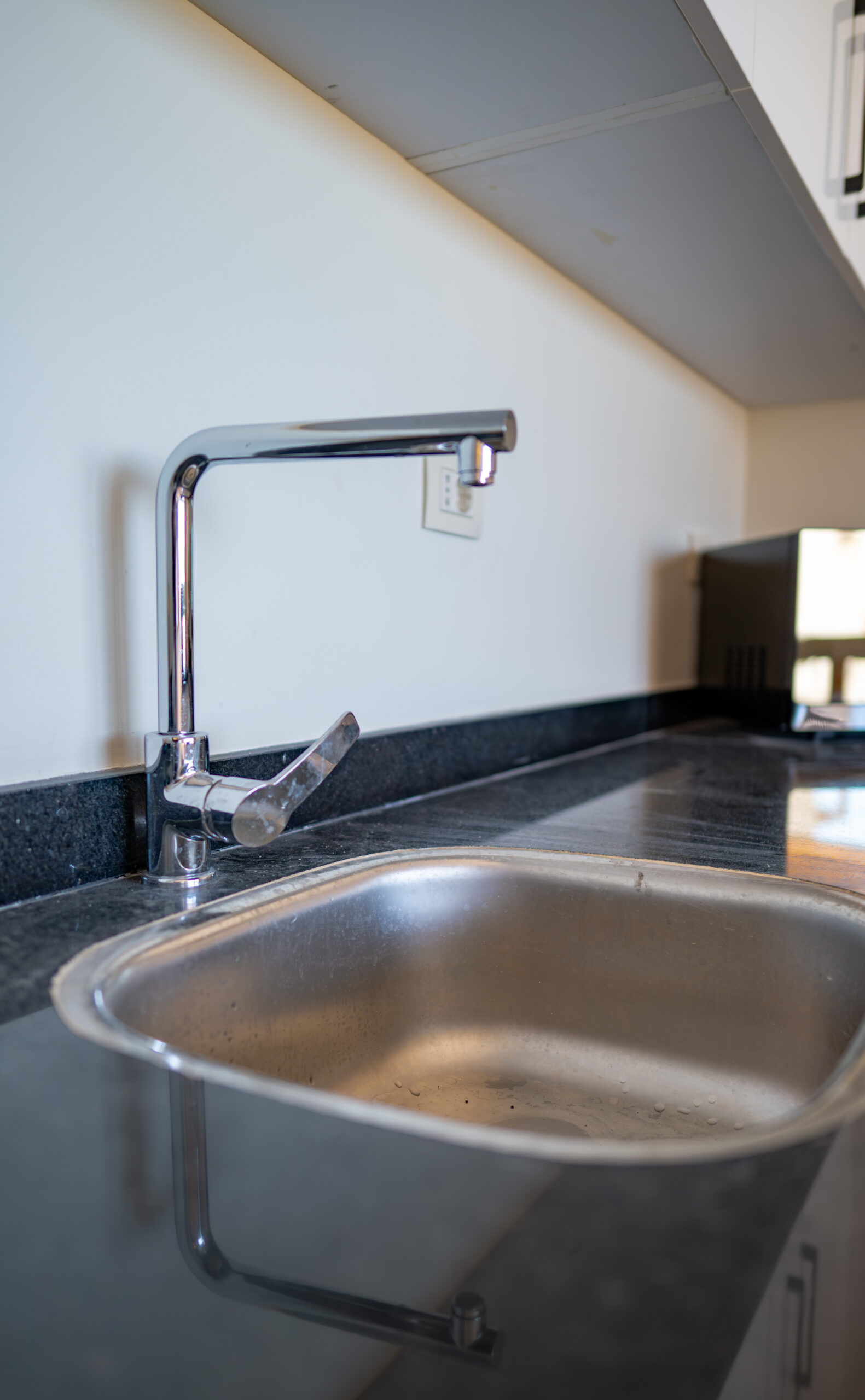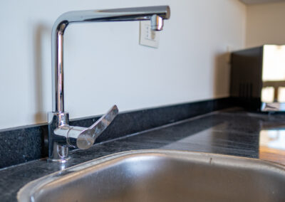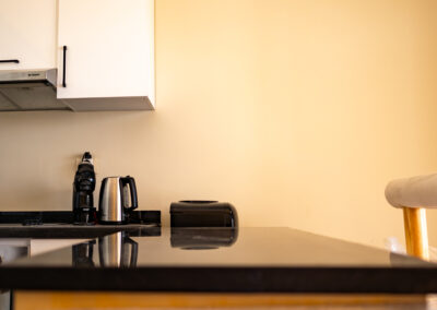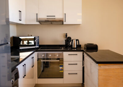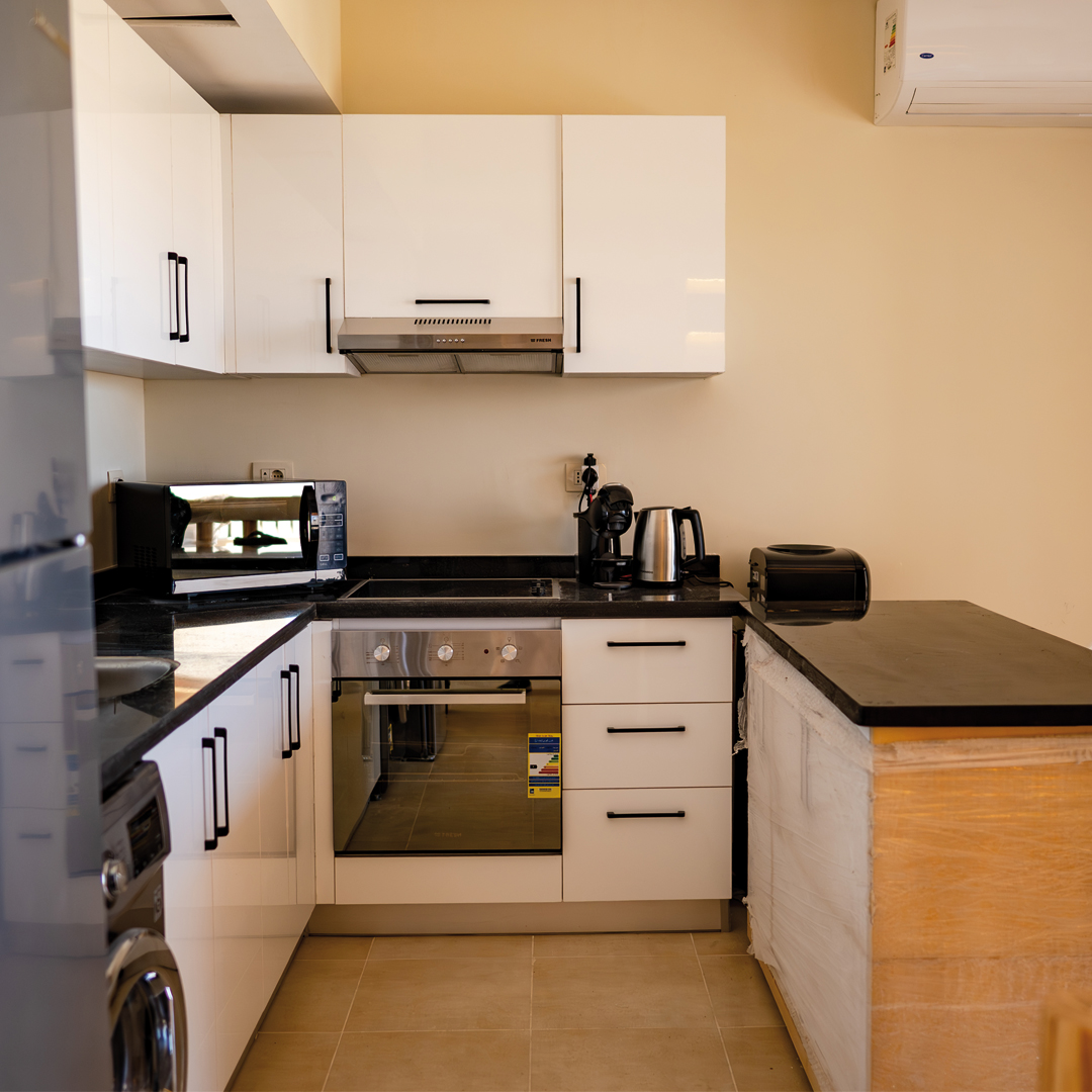 Experience the perfect blend of form and function in this efficiently designed, contemporary kitchenette. The space features sleek high-gloss white cabinetry both overhead and under the counter, beautifully contrasted with black rectangular handles and a bold black granite countertop. This classic black-and-white palette ensures a timeless, sophisticated look. Essential appliances are seamlessly integrated, including a built-in oven and stovetop, with ample counter space for the provided small appliances. The thoughtful layout maximizes utility, making it an ideal and practical space for short stays. Every detail, from the durable finishes to the modern aesthetic, exemplifies Green Structure’s promise of quality and sophisticated living.