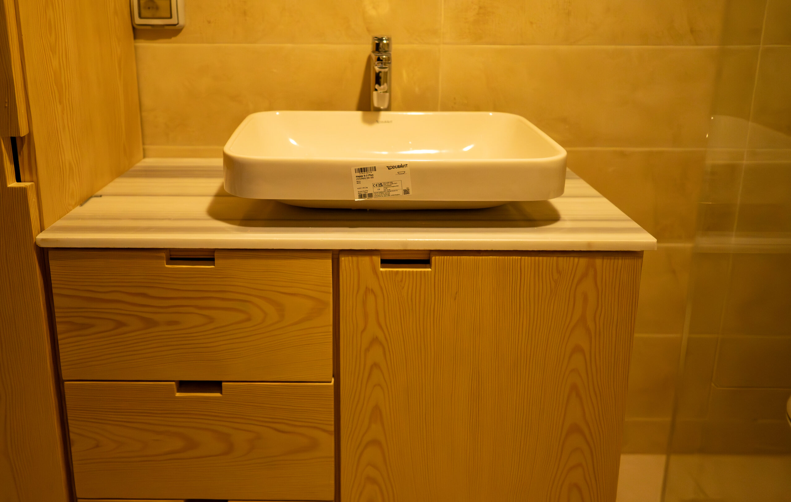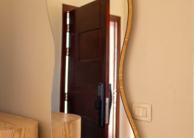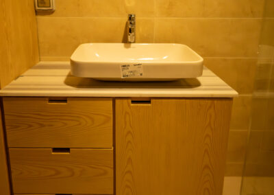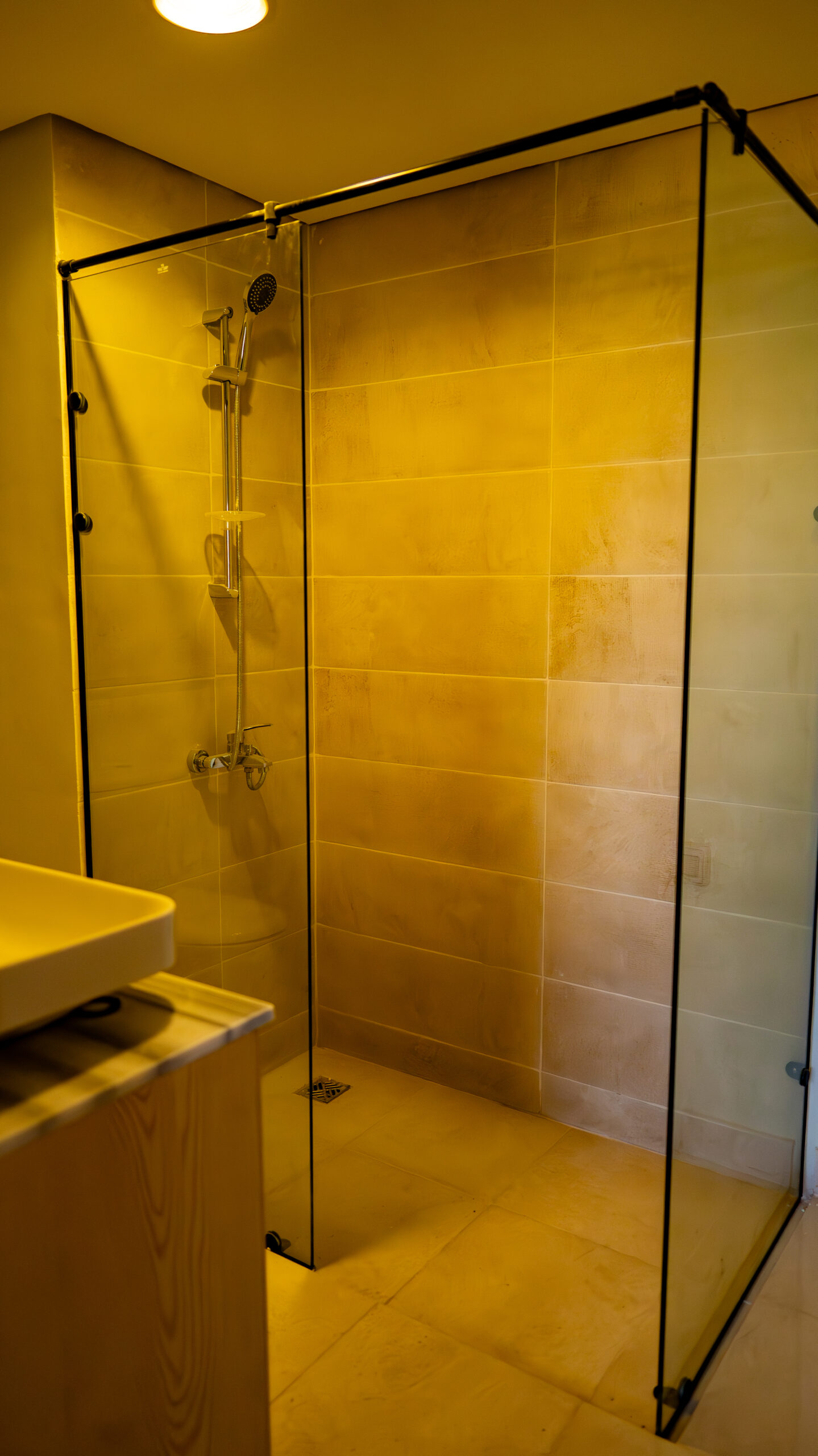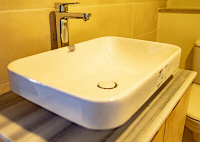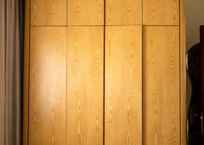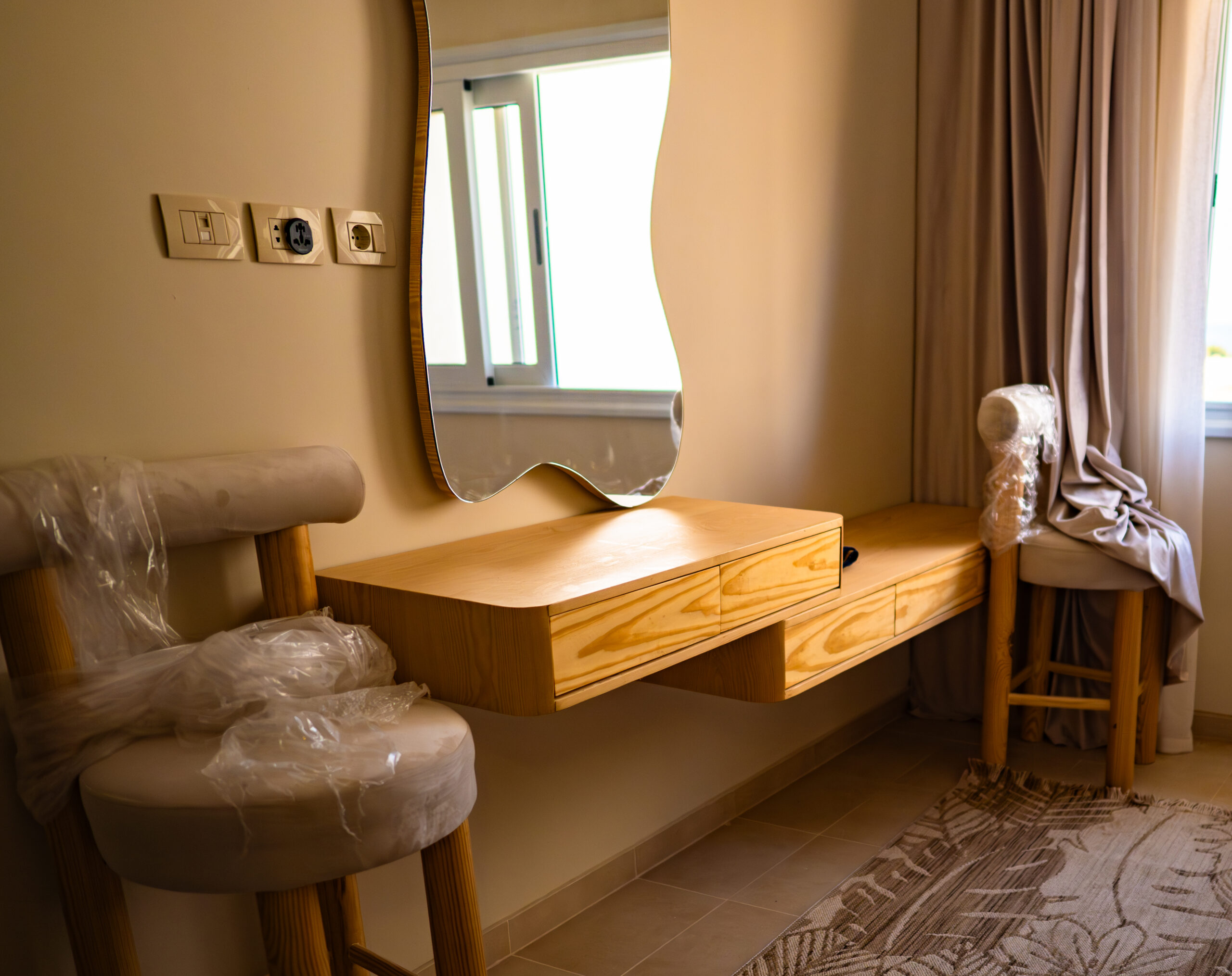 Experience the perfect blend of form and function in this efficiently designed, contemporary kitchenette. The space features sleek high-gloss white cabinetry both overhead and under the counter, beautifully contrasted with black rectangular handles and a bold black granite countertop. This classic black-and-white palette ensures a timeless, sophisticated look. Essential appliances are seamlessly integrated, including a built-in oven and stovetop, with ample counter space for the provided small appliances. The thoughtful layout maximizes utility, making it an ideal and practical space for short stays. Every detail, from the durable finishes to the modern aesthetic, exemplifies Green Structure’s promise of quality and sophisticated living.